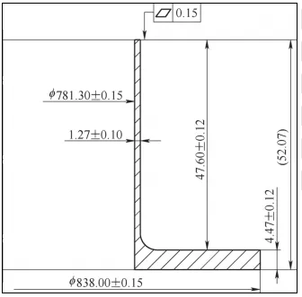 The outer diameter is (838.00 ± 0.15) mm, the minimum inner diameter is φ(781.30 ± 0.15) mm, the total height is 52.07 mm, and the wall thickness is (1.27 ± 0.10) mm.
