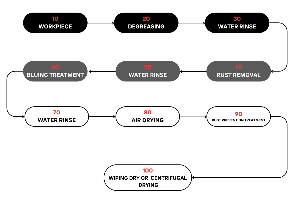 Workpiece → Degreasing → Water Rinse → Rust Removal → Water Rinse → Bluing Treatment → Water Rinse → Air Drying → Rust Prevention Treatment → Wiping Dry or Centrifugal Drying.
